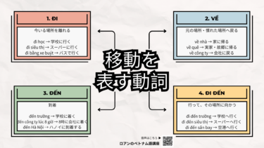 こんにちは!ロアンのベトナム語講座、プロダクトマネージャーのMy(ミー)です。 このページでは、移動を表す動詞をまとめました。 まずは、気になるものから再生してみてください […]