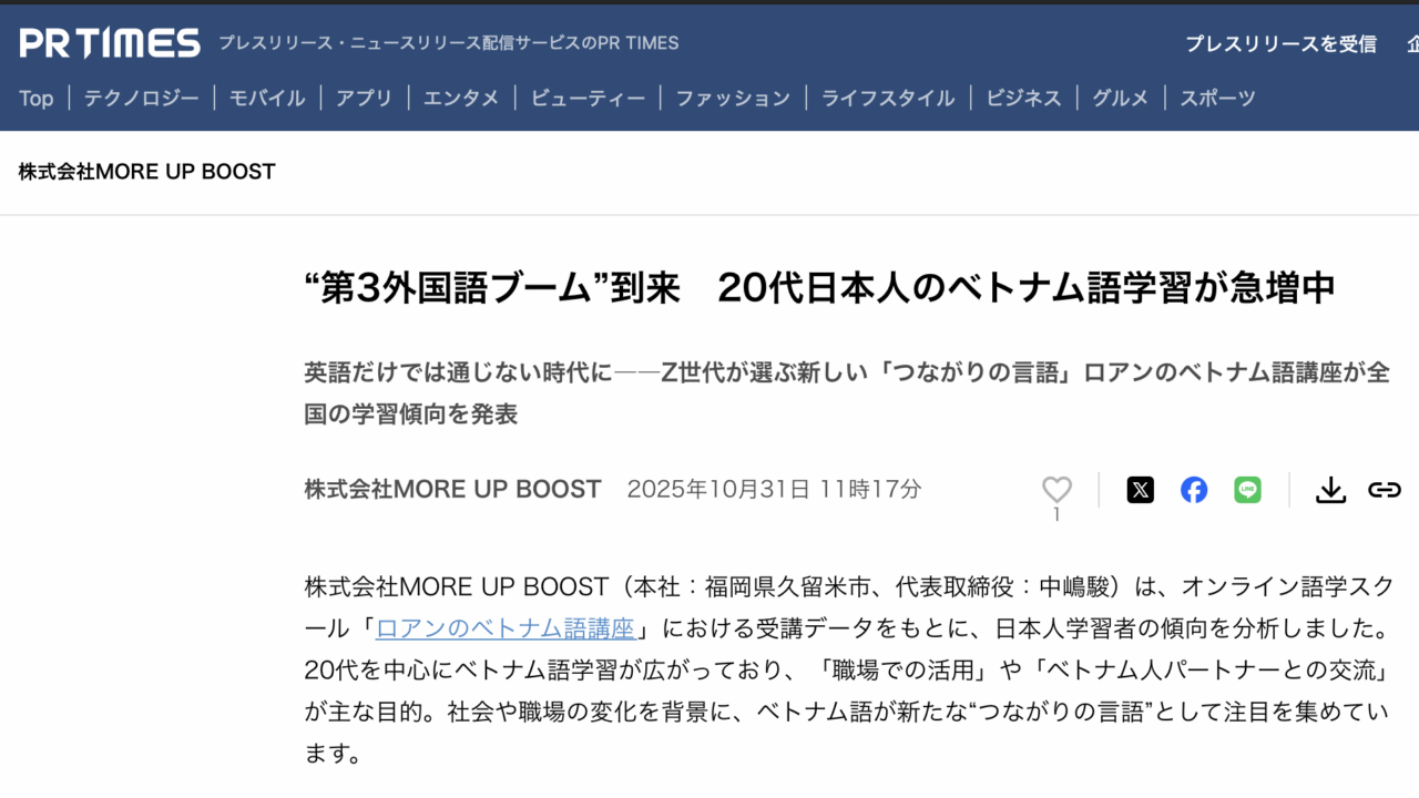 PR TIMES|“第3外国語ブーム”到来 20代日本人のベトナム語学習が急増中