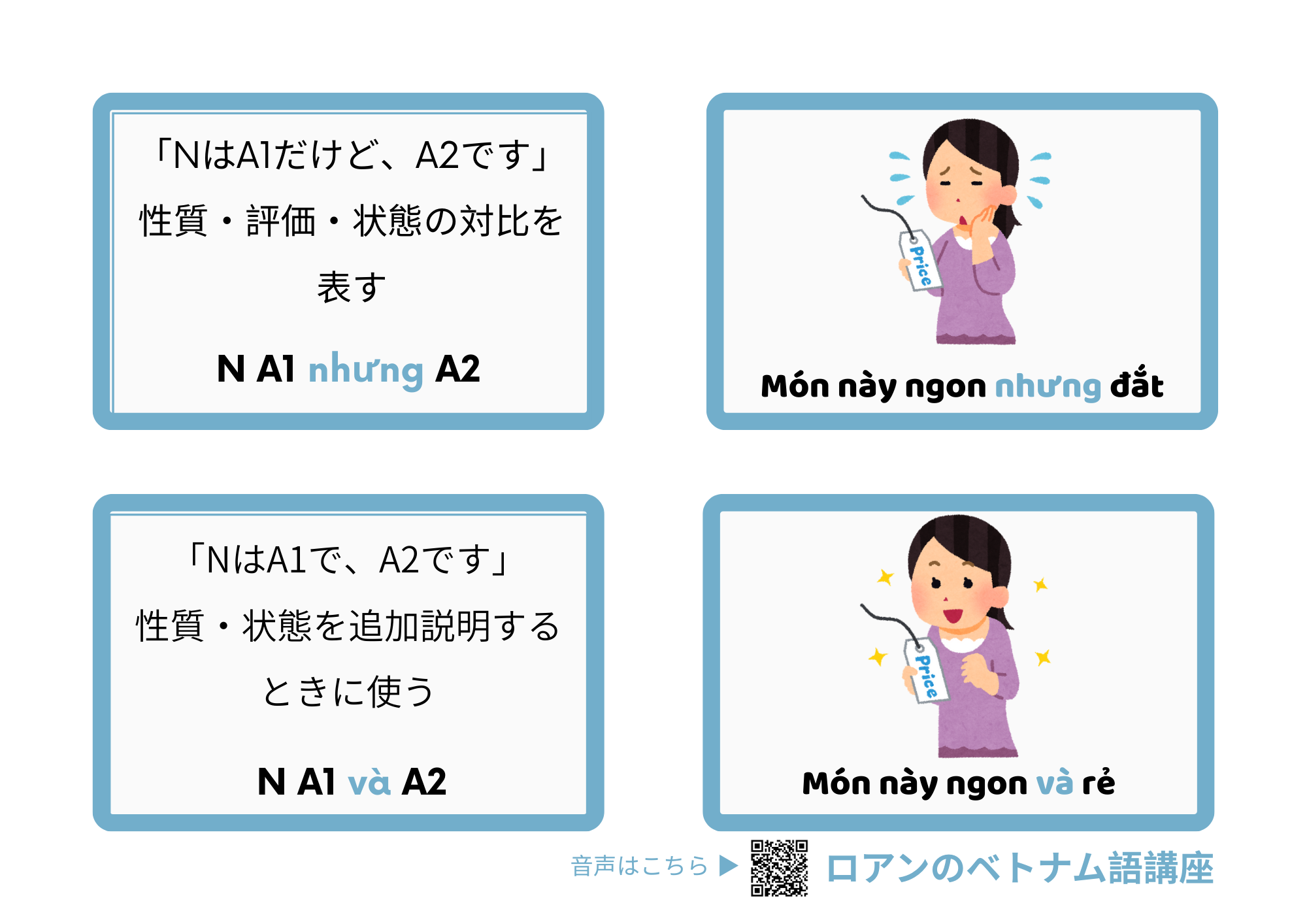 | Món này ngon nhưng đắt. | これはおいしいけど高い。 | |