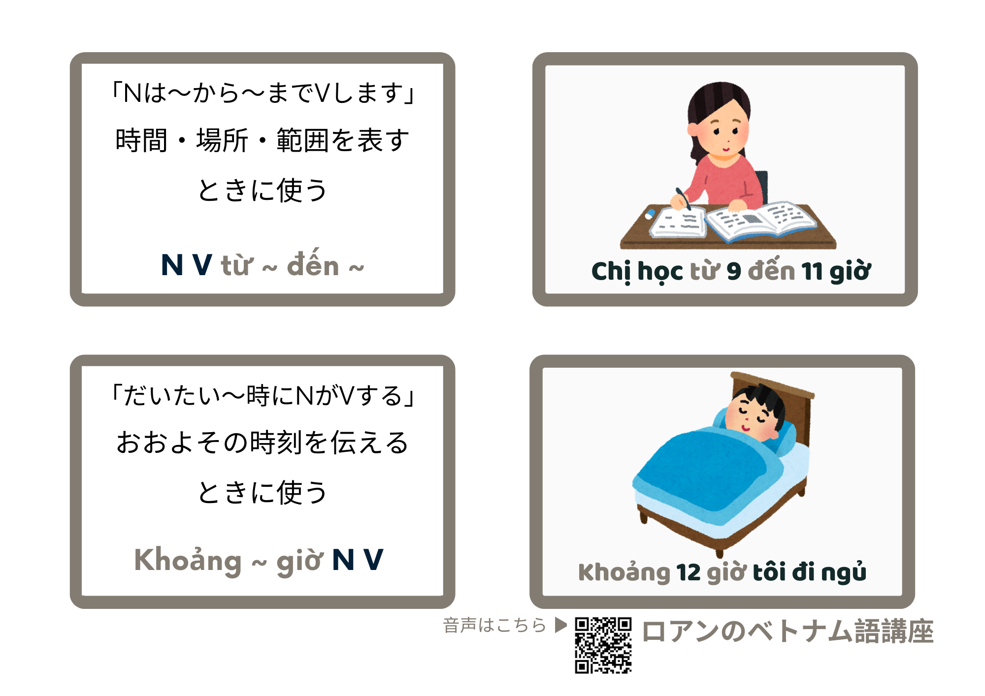 | Chị học từ 9 đến 11 giờ | 彼女は9時から11時まで勉強します。 | |
